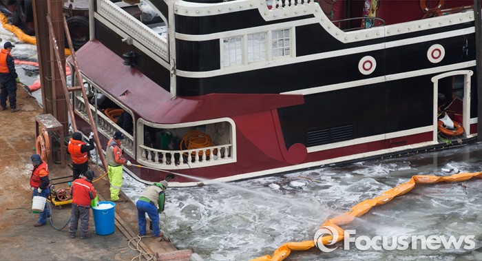(서울=포커스뉴스) 28일 오후 서울 한강 영동대교 인근에서 예인업체 관계자들이 침수된 이랜드 크루즈 유람선 주변에 유화제를 뿌리고 있다.