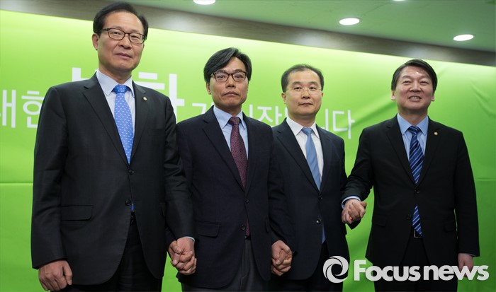 (서울=포커스뉴스) 안철수 국민의당 인재영입위원장이 28일 오후 서울 마포구 국민의당 당사에서 열린 입당기자회견에서 이건태(오른쪽) 전 검사와 정재흠 회계사를 소개하고 있다. (왼쪽부터) 문병호 창준위 부위원장, 정재흠, 이건태 전 검사, 안철수 의원.