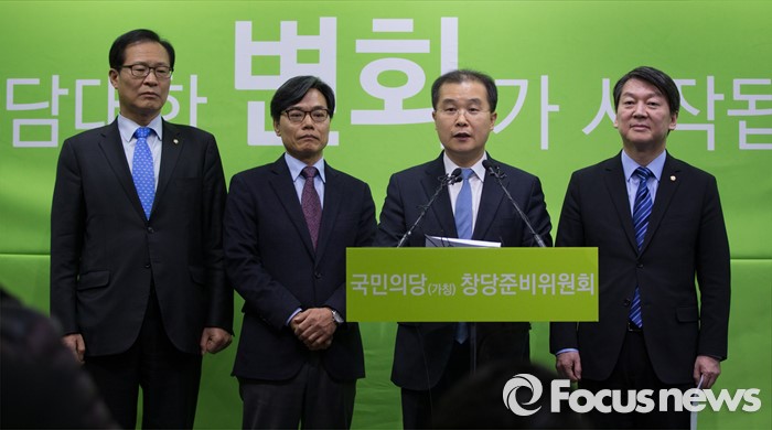 (서울=포커스뉴스)이건태 전 검사가 28일 오후 서울 마포구 국민의당 당사에서 열린 입당기자회견에서 입당 소감을 밝히고 있다. (왼쪽부터) 문병호 창준위 부위원장, 정재흠, 이건태 전 검사, 안철수 의원