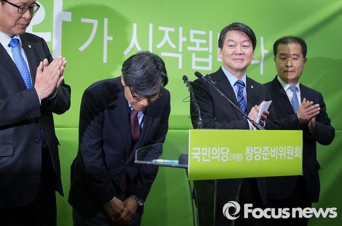 (서울=포커스뉴스) 안철수 국민의당 인재영입위원장이 28일 오후 서울 마포구 국민의당 당사에서 열린 입당기자회견에서 이건태 전 검사와 정재흠 회계사를 소개하고 있다. (왼쪽부터) 문병호 창준위 부위원장, 정재흠, 안철수, 이건태