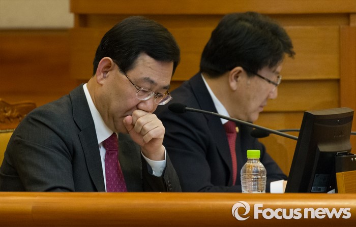 (서울=포커스뉴스) 28일 오후 서울 종로구 헌법재판소 대심판정에서 새누리당 주호영(왼쪽부터), 권성동 의원이 국회 선진화법 권한쟁의 공개변론에 앞서 청구인석에 앉아 자료를 검토하고 있다.
