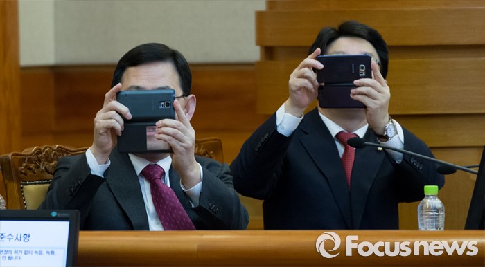 (서울=포커스뉴스) 28일 오후 서울 종로구 헌법재판소 대심판정에서 새누리당 주호영(왼쪽부터), 권성동 의원이 국회 선진화법 권한쟁의 공개변론에 앞서 취재진과 법정 내부를 기념촬영하고 있다.