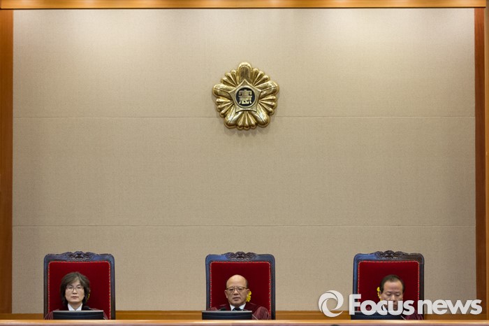 (서울=포커스뉴스) 28일 오후 서울 종로구 헌법재판소 대심판정에서 박한철(가운데) 헌법재판소장이 국회 선진화법 권한쟁의 공개변론 시작을 기다리고 있다.