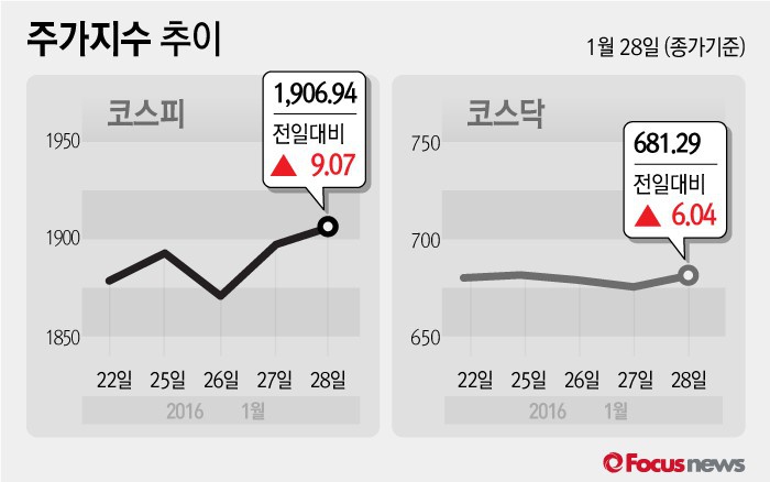 (서울=포커스뉴스) 28일 코스피지수는 전날 보다 0.48%(9.07포인트) 오른 1906.94에 장을 마쳤다. 코스닥지수는 전일 대비 0.89%(6.04포인트) 오른 681.29에 마감했다.