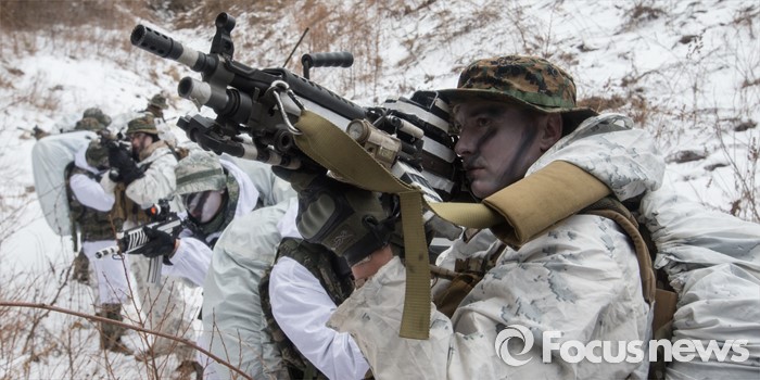 (평창=포커스뉴스) 28일 강원도 평찬군 황병산 해병대 산악 종합훈련장에서 열린 '한·미 해병대 연합 동계 설한지 훈련'에 해병대 수색대대와 미 해병대 3사단 수색중대 장병들이 참가하고 있다.