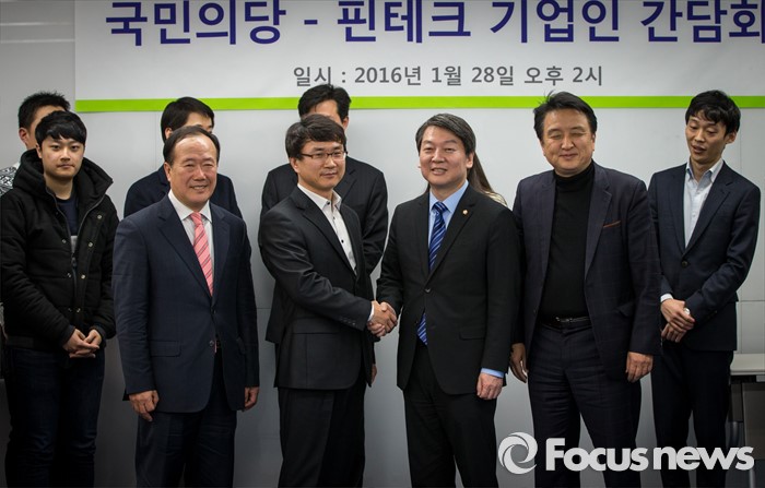 (서울=포커스뉴스) 28일 오후 서울 강남구 창업지원센터에서 열린 '국민의당-핀테크 기업인 간담회'에 참석한 안철수(오른쪽 세번째) 인재영입위원장이 국민의당 정책자문으로 영입된 유철종(왼쪽 세번째) 크라우드연구소 대표와 악수하고 있다.