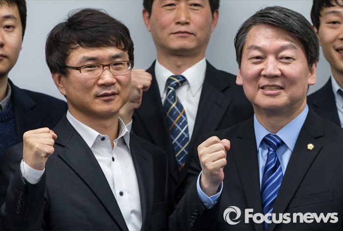 (서울=포커스뉴스) 28일 오후 서울 강남구 창업지원센터에서 열린 '국민의당-핀테크 기업인 간담회'에 참석한 안철수(오른쪽) 인재영입위원장이 국민의당 정책자문으로 영입된 유철종 크라우드연구소 대표와 기념촬영을 갖고 있다.