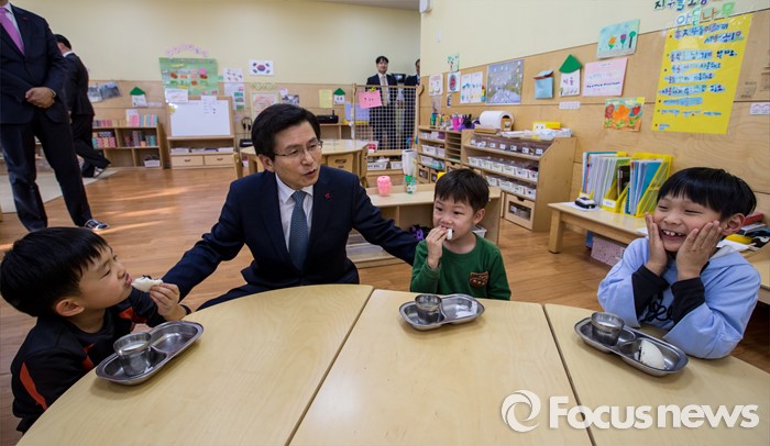 (서울=포커스뉴스) 만3-5세 유아에게 공통적으로 제공하는 교육, 보육 과정인 누리과정 예산 파행으로 보육대란이 이어지고 있는 28일 오후 서울 종로구 한 어린이집을 찾은 황교안 국무총리가 어린이들과 대화를 나누고 있다.