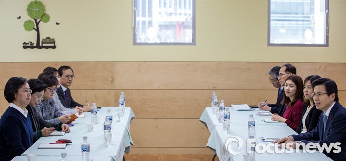 (서울=포커스뉴스) 만3-5세 유아에게 공통적으로 제공하는 교육, 보육 과정인 누리과정 예산 파행으로 보육대란이 이어지고 있는 28일 오후 서울 종로구 한 어린이집을 찾은 황교안 국무총리가 교사들과 간담회에 앞서 인사말을 하고 있다.