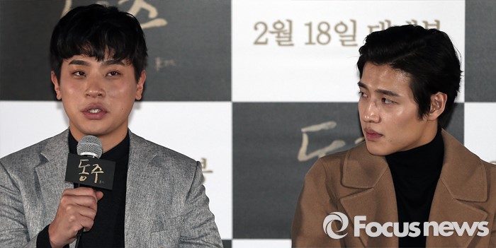 (서울=포커스뉴스) 28일 오후 서울 동대문 메가박스에서 열린 영화 '동주' 언론시사회에 참석한 배우 박정민이 취재진의 질문에 답하고 있다. 왼쪽부터 배우 박정민, 강하늘.