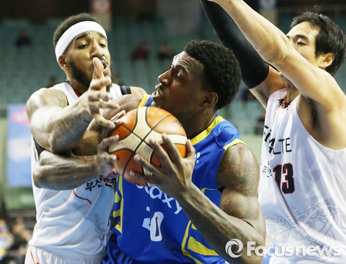 (서울=포커스뉴스) 28일 서울 잠실실내체육관에서 열린 2015-2016 프로농구 삼성-KT 경기에서 KT 심스와 김현민이 삼성 라틀리프를 둘러싸며 압박수비를 하고 있다.
