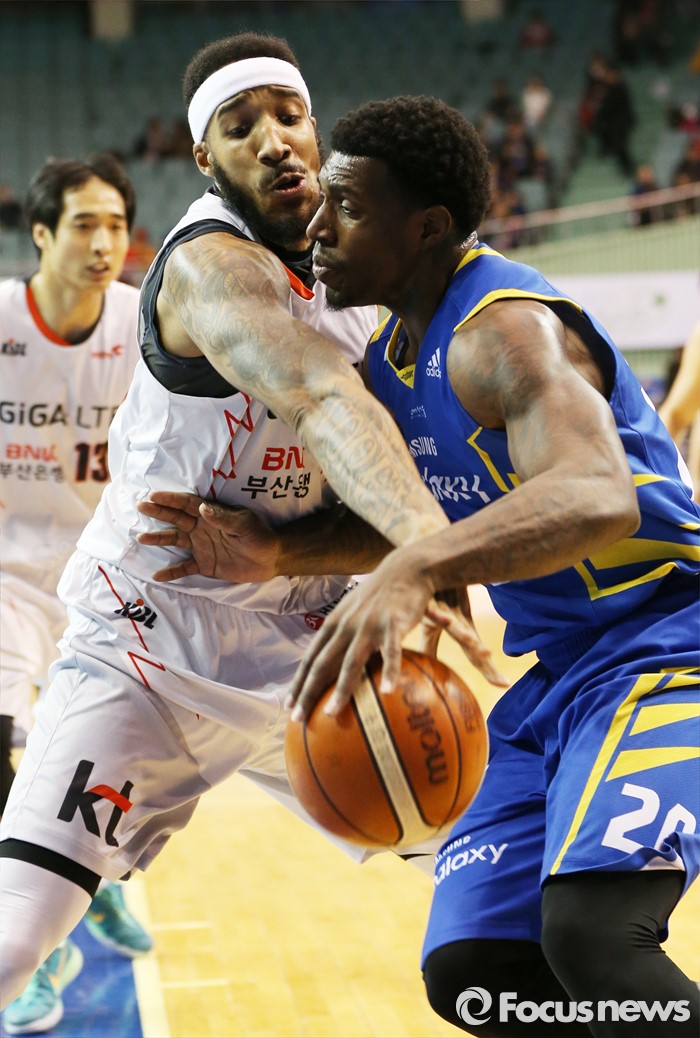 (서울=포커스뉴스) 28일 서울 잠실실내체육관에서 열린 2015-2016 프로농구 삼성-KT 경기에서 KT 심스가 삼성 라틀리프의 골밑 돌파를 저지하고 있다.