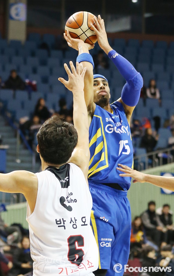 (서울=포커스뉴스) 28일 서울 잠실실내체육관에서 열린 2015-2016 프로농구 삼성-KT 경기에서 삼성 문태영이 KT 박상오를 앞에 두고 미들슛을 시도하고 있다.
