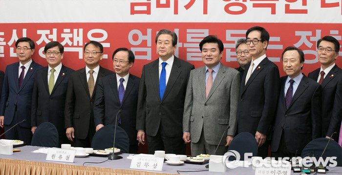 (서울=포커스뉴스) 김무성(왼쪽 다섯번째) 새누리당 대표와 유일호(왼쪽 세번째) 경제부총리 겸 기획재정부 장관 등 참석자들이 29일 오전 서울 여의도 국회에서 열린 저출산 대책 당정협의에 참석해 기념사진을 찍고 있다. 왼쪽부터 이기권 노동부 장관, 정진엽 보건복지부 장관, 유 부총리, 이주영 저출산대책특위 위원장, 김 대표, 원유철 원내대표, 조동원 홍보기획본부장, 이준식 사회부총리 겸 교육부 장관, 홍일표 저출산특위부위원장, 강호인 국토교통부 장관.