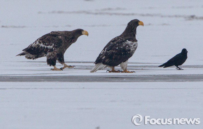 (하남=포커스뉴스) 국제희귀조 참수리(멸종위기동물 1급,천연기념물243호) 아성조와 유조(왼쪽)가 29일 오전 경기도 하남시 미사리 한강의 얼음판에 나타났다. 올 겨울 이 지역에서 월동 중인 참수리는 성조 2마리, 아성조 1마리, 유조 1마리 등 총 4마리로 운이 좋으면 좀 처럼 눈에 목격되지 않는 참수리의 모든 모습을 몰 수 있다.