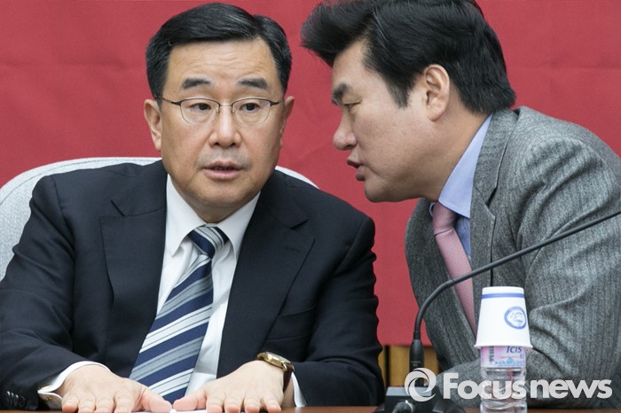 (서울=포커스뉴스) 원유철(오른쪽) 새누리당 원내대표와 김정훈 정책위의장이 29일 오전 서울 여의도 국회에서 열린 원내대책회의에 참석해 대화하고 있다.