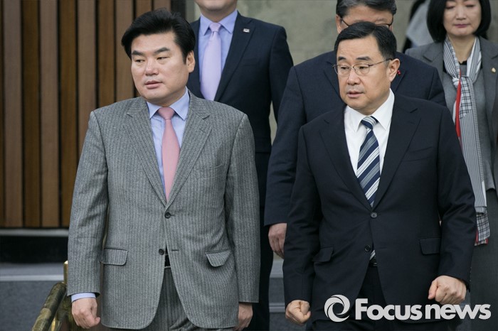 (서울=포커스뉴스) 원유철(앞줄 왼쪽) 새누리당 원내대표와 김정훈(앞줄 오른쪽) 정책위의장을 비롯한 의원들이 29일 오전 서울 여의도 국회에서 열린 원내대책회의에 참석하고 있다.
