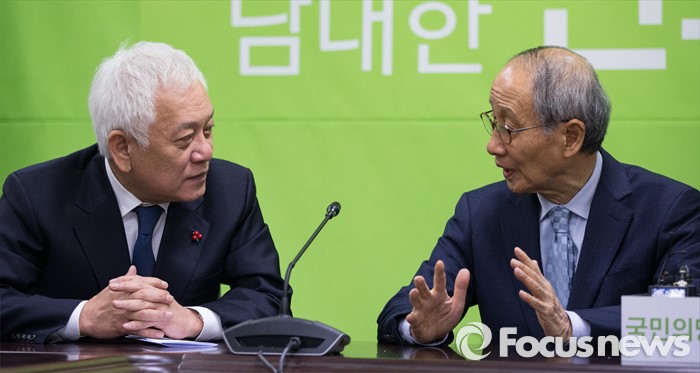 (서울=포커스뉴스) 국민의당 김한길 의원이 29일 오전 서울 마포구 국민의당 당사에서 열린 기획조정회의에서 윤여준 공동창준위원장과 대화하고 있다..
