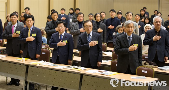 (세종=포커스뉴스) 29일 오전 세종시 정부세종컨벤션센터 국제회의장에서 열린 국가균형발전선언 12주년 기념행사에 참석한 내빈들이 국기에 대한 경례를 하고 있다. 앞줄 오른쪽부터 이정우 한국미래발전연구원 이사장, 이해찬 노무현재단이사장, 권선택 대전시장, 이춘희 세종시장, 안희정 충남도지사.