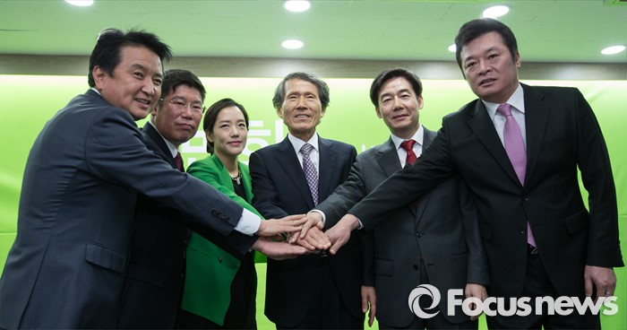 (서울=포커스뉴스) 국민의당 한상진 공동창당준비위원장과 김영환 의원이 29일 서울 마포구 국민의당 당사에서 열린 방송 정치평론가 4인 입당 기자회견에서 포즈를 취하고 있다. 왼쪽부터 김영환 의원, 김경진 변호사, 강연재 변호사, 한상진 위원장, 이용호 정치평론가, 김철근 동국대 겸임교수.