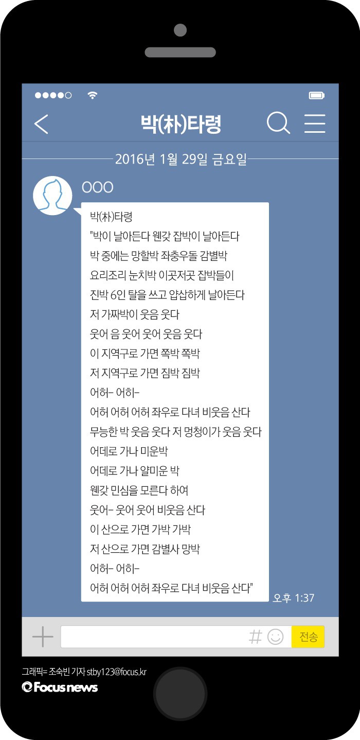 (서울=포커스뉴스) '박이 날아든다 웬갖(온갖) 잡박이 날아든다'는 가사를 담은 '박(朴) 타령'이 카카오톡 등에서 확산되는 등, 새누리당 일각의 '진박(진실한 친박) 마케팅'을 풍자하는 풍자물이 잇따르고 있다.