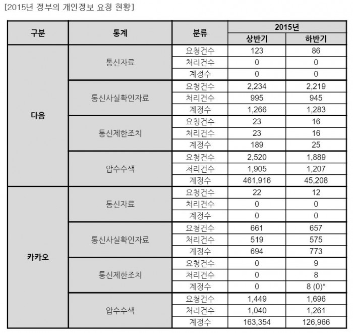한편 이번 보고서에는 지난해 7~12월까지 정부기관이 관계 법령에 따라 요청한 개인정보 관련 통계는 물론, 불법 유해 정보, 저작권 및 상표권 침해, 개인정보 노출, 명예훼손 게시물 등에 대한 처리 건수도 함께 업데이트 됐다. 해당 통계는 2012년 상반기부터 반기별로 확인 가능합니다. 자세한 내용은 카카오 프라이버시 정책 및 투명성 보고서 사이트(privacy.kakaocorp.com)를 통해 확인할 수 있다.2015년 정부의 개인정보 요청현황 <사진제공=카카오>