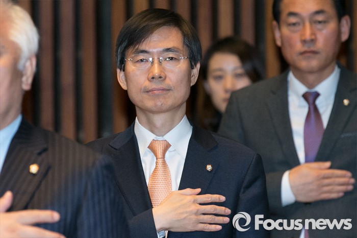 (서울=포커스뉴스) 새누리당에 입당한 조경태(가운데) 의원이 29일 오후 서울 여의도 국회에서 열린 새누리당 의원총회에 참석해 국민의례하고 있다.