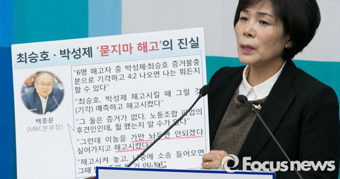 (서울=포커스뉴스) 최민희 더불어민주당 의원이 29일 오후 서울 여의도 국회에서 열린 의원총회에 참석해 지난 2012년 파업으로 해고된 MBC 최승호 PD, 박성제 기자와 관련된 백종문 MBC 미래전략본부장의 녹취록을 들고 발언하고 있다.