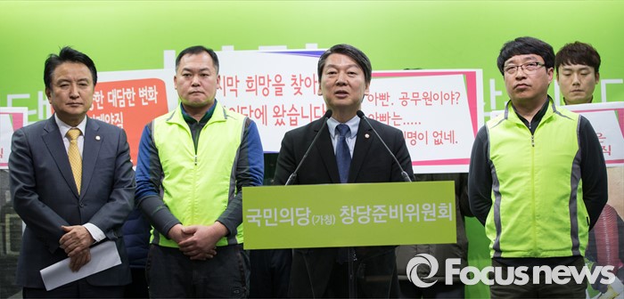 (서울=포커스뉴스) 국민의당 안철수 의원이 29일 오후 서울 마포구 국민의당 당사에서 시설관리원 배성춘씨와 환경미화원 임종성씨의 입당을 밝히고 있다. 왼쪽부터 김영환 전략위원장, 임종성씨, 안철수 의원, 배성춘