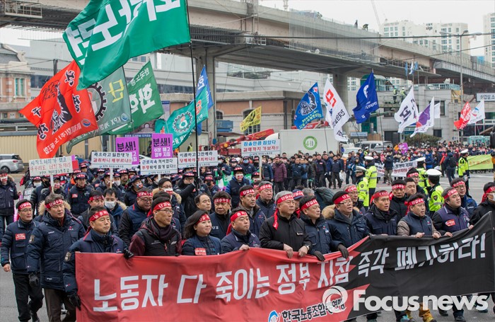 (서울=포커스뉴스) 29일 오후 서울역 광장에서 열린 '한국노총 전국 단위노조 대표자 총력투쟁 결의대회'에 참석한 조합원들이 서울광장을 향해 행진하고 있다.