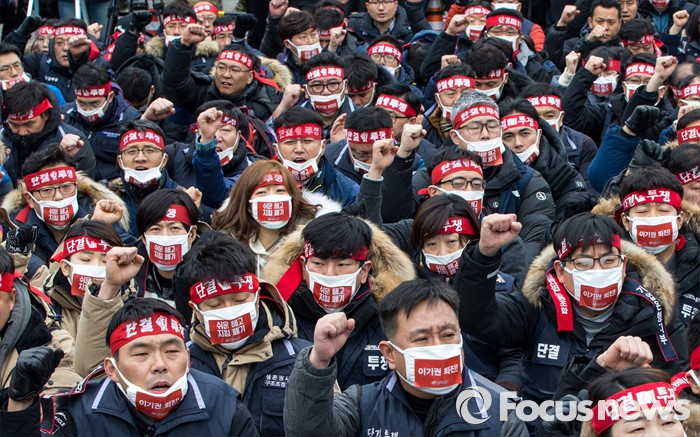 (서울=포커스뉴스) 29일 오후 서울역 광장에서 열린 '한국노총 전국 단위노조 대표자 총력투쟁 결의대회'에 참석한 조합원들이 정부가 발표한 양대 행정지침 폐기를 촉구하는 구호를 외치고 있다.