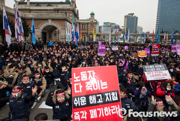 (서울=포커스뉴스) 29일 오후 서울역 광장에서 열린 '한국노총 전국 단위노조 대표자 총력투쟁 결의대회'에 참석한 조합원들이 정부가 발표한 양대 행정지침 폐기를 촉구하는 구호를 외치고 있다.