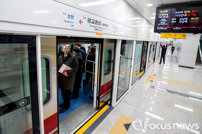 (수원=포커스뉴스) 29일 오후 경기도 수원시 영통구 신분당선 광교중앙역에서 열린 '정자-광교 복선전철 개통행사'를 마친 국토교통부 관계자 및 시공사, 경기철도 관계자들이 시승 하고 있다.