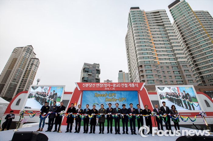 (수원=포커스뉴스) 강호인(가운데) 국토교통부 장관을 비롯한 주요내빈들이 29일 오후 경기도 수원시 영통구 신분당선 광교중앙역에서 열린 '정자-광교 복선전철 개통행사'에 자리해 테이프를 절단하며 신분당선 연장 개통을 축하하고 있다.