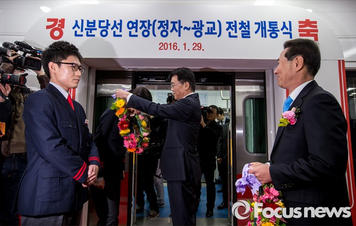 (수원=포커스뉴스) 강호인(오른쪽 두 번째) 국토교통부 장관이 29일 오후 경기도 수원시 영통구 신분당선 광교중앙역에서 열린 '정자-광교 복선전철 개통행사'를 마친 뒤 시승에 앞서 역무원에게 꽃목걸이를 전달 하고 있다.