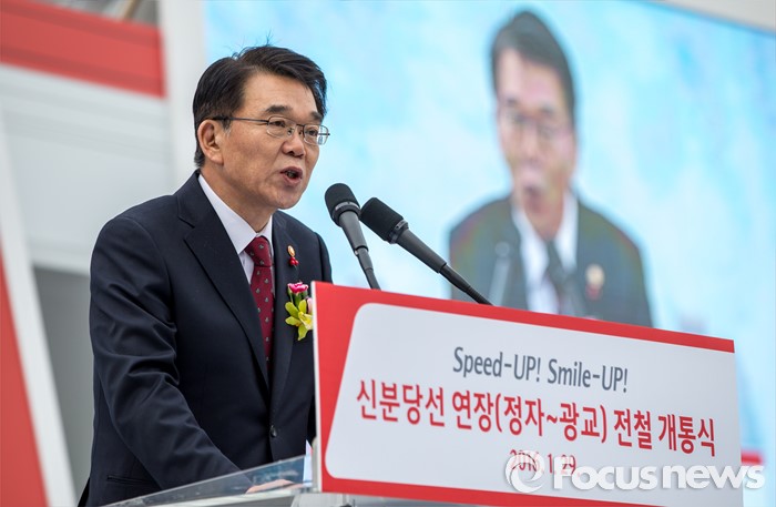 (수원=포커스뉴스) 강호인 국토교통부 장관이 29일 오후 경기도 수원시 영통구 신분당선 광교중앙역에서 열린 '정자-광교 복선전철 개통행사'에 자리해 치사 하고 있다.