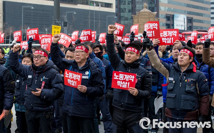 (서울=포커스뉴스) 29일 오후 서울 종로구 정부서울청사 앞에서 열린 금속노조 총파업대회에 참가한 조합원들이 노동개악을 규탄하는 손팻말을 들고 있다.