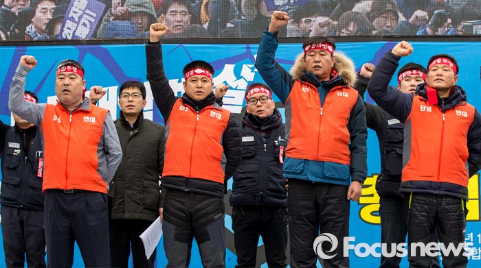 (서울=포커스뉴스) 29일 오후 서울 종로구 정부서울청사 앞에서 열린 '2대지침 폐기, 양대노총 공동투쟁 및 불복종 투쟁 선포식'에 참석한 양대노조 제조공투본 위원장들이 투쟁선언문 낭독 후 구호를 외치고 있다. 앞줄 왼쪽부터 김동명 한국노총 화학노련 위원장, 김상구 민주노총 금속노조 위원장, 김만재 한국노총 금속노련 위원장, 신환섭 민주노총 화섬연맹 위원장.