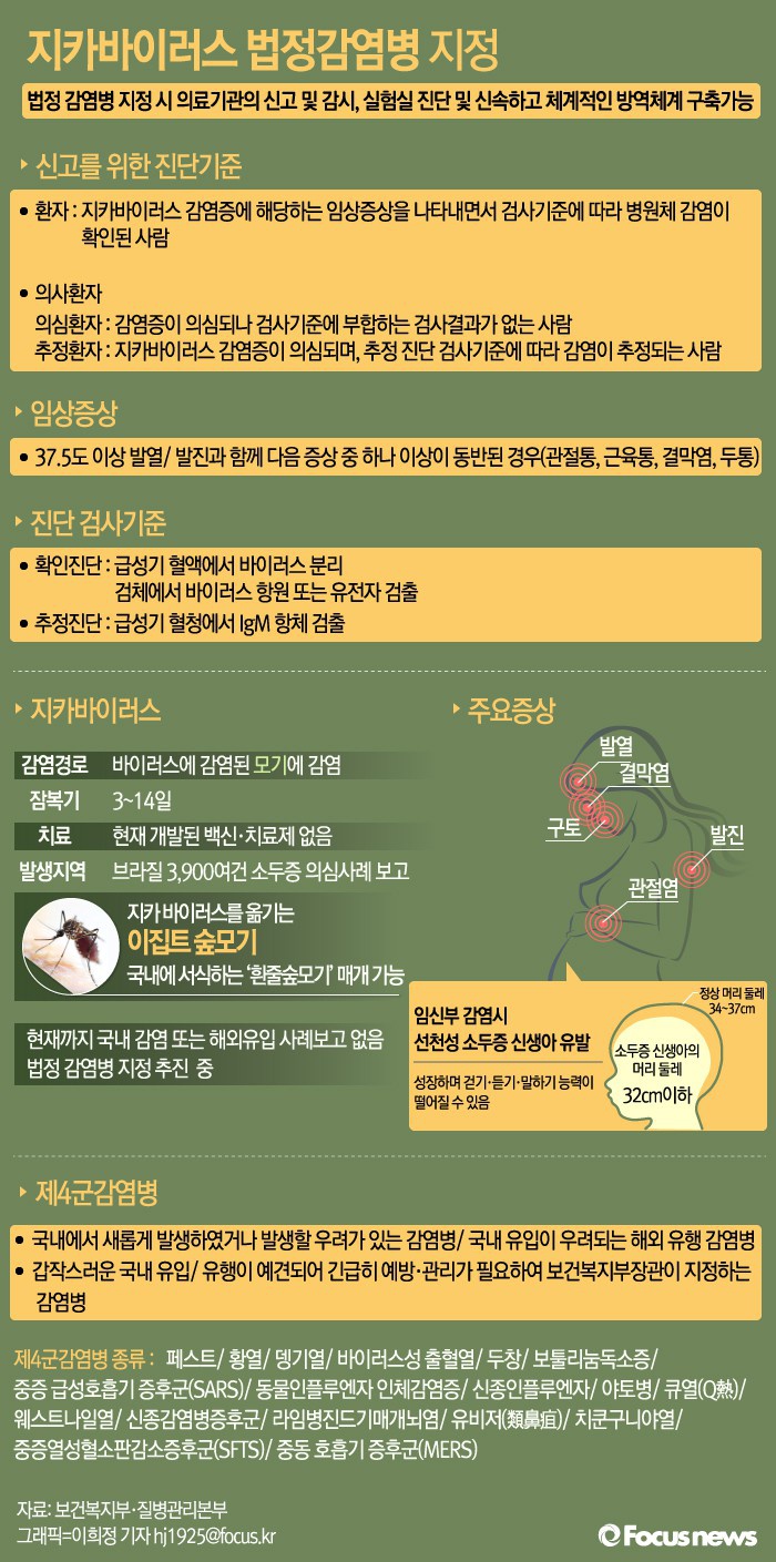 (서울=포커스뉴스) 질병관리본부는 ‘소두증 바이러스’라고 불리는 지카바이러스(Zika virus) 감염증을 제4군 법정감염병으로 지정한다고 29일 밝혔다. 지카바이러스 감염증이 법정감염병으로 지정됨에 따라 감염증 환자 및 의심환자를 진료한 의료기관은 의무적으로 관할 보건소에 신고를 해야 한다.