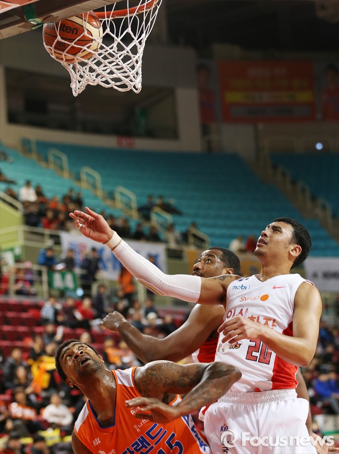 (인천=포커스뉴스) 29일 인천 삼산체육관에서 열린 2015-2016 프로농구 전자랜드-SK 경기에서 전자랜드 포웰이 슈팅후 볼이 림을 통과하는것을 쳐다 보고 있다. SK 사이먼과 박승리.