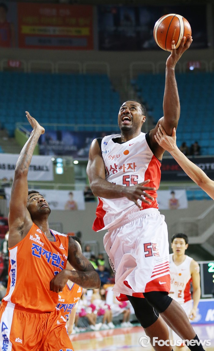 (인천=포커스뉴스) 29일 인천 삼산체육관에서 열린 2015-2016 프로농구 전자랜드-SK 경기에서 SK 사이먼이 전자랜드 포웰의 마크를 피해 레이업슛을 시도하고 있다.