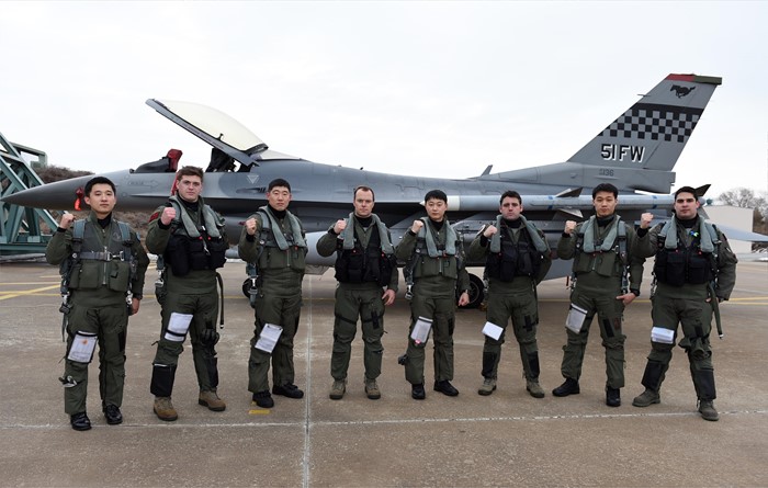 (서울=포커스뉴스) 지난 28일 충남 서산공군기지에서 열린 쌍매훈련에서 한·미 조종사들이 F-16CM 전투기 앞에서 파이팅 포즈를 취하고 있다. <사진제공=공군>