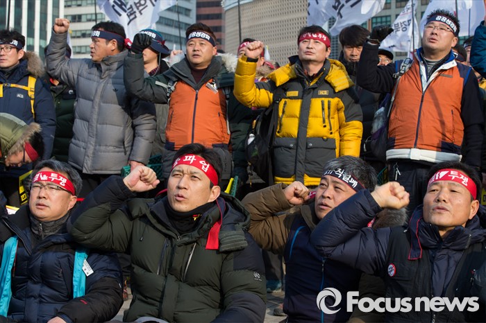(서울=포커스뉴스) '민주노총 전국노동자대회'가 열린 30일 오후 서울광장에서 민주노총 조합원들이 정부의 '일반 해고'와 '취업규칙 변경' 양대 지침 철회와 노동개악 중단을 촉구하고 있다.