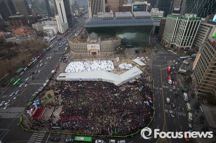 (서울=포커스뉴스) 30일 오후 서울광장에서 열린 '민주노총 전국노동자대회'에서 민주노총 조합원들이 정부의 '일반 해고'와 '취업규칙 변경' 양대 지침 철회와 노동개악 중단을 촉구하는 집회를 열고 있다.
