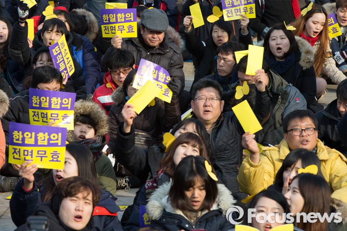 (서울=포커스뉴스) 한일 일본군 위안부 합의 무효와 정의로운 해결을 위한 전국행동 회원들이 30일 오후 서울광장에서 열린 '한일합의 무효선언 전국행동의 날' 행사에서 피켓과 노란 봉투를 들고 있다. 노란 봉투는 한국정신대문제대책협의회의 '일본군 위안부 손잡는 정의기억재단' 출연금 모금을 위한 것이다.