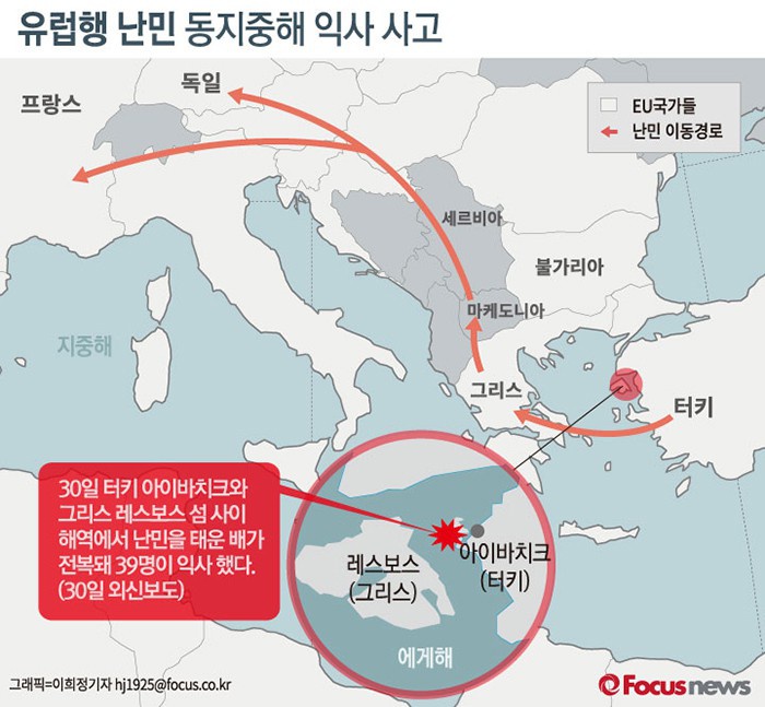 (서울=포커스뉴스)외신에 따르면 30일 아침 터키와 그리스 사이 해역에서 난민을 태운 배가 전복돼 최소 39명이 숨졌다.