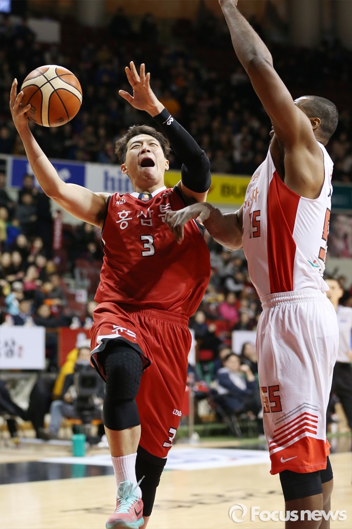 (안양=포커스뉴스) 31일 안양실내체육관에서 열린 2015-2016 프로농구 KGC-SK 경기에서 KGC 이정현이 SK 사이먼의 마크를 받으며 레이업슛을 시도하고 있다.
