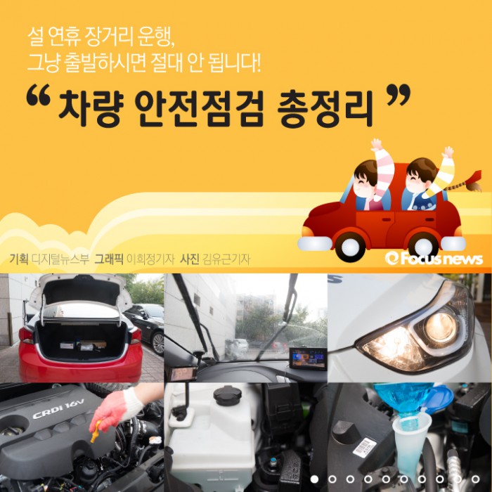 (서울=포커스뉴스) 이번 설 연휴에 장거리 자동차 운행을 계획하신 분들 많으시죠? 겨울철에는 안전한 운행을 위해 점검해야 할 것들이 많습니다. 온 가족이 함께 떠나는 길인 만큼 이번엔 차량 점검을 꼼꼼히 한 후에 출발하시기를 권해드립니다. 아래의 일곱 가지만이라도 꼭 점검해 주세요. 오래 걸리지 않습니다.