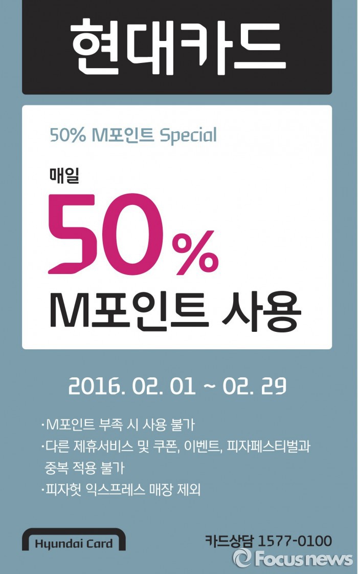 (서울=포커스뉴스) 한국 피자헛은 현대카드와 제휴를 맺고 현대카드M으로 제품을 구매하면 금액의 50%를 M포인트로 결제할 수 있는 서비스를 2월 한 달간 제공한다.