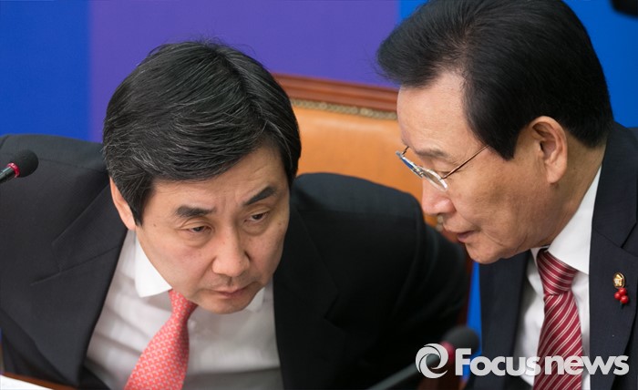(서울=포커스뉴스) 이종걸(왼쪽) 더불어민주당 원내대표와 변재일 비대위원이 1일 오전 서울 여의도 국회에서 열린 비상대책위원회의에 참석해 대화하고 있다.